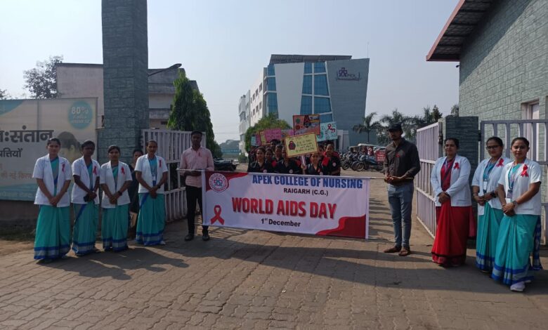 आज एक दिसंबर को विश्व ऐड्स दिवस के उपलक्ष्य में एपेक्स नर्सिंग कॉलेज के विद्यार्थियों द्वारा ऐड्स रोग के कारक, लक्षण ,उपचार को प्रदर्शित करते हुए रायगढ़ में एपेक्स नर्सिंग कॉलेज से लेकर कबीर चौक तक जनजागरूकता रैली निकाला गया,जिसका उद्देश्य है की रायगढ़ वासी ऐड्स रोग के प्रति जागरूक रहें। प्रति वर्ष हमारा यही प्रयास रहता है की अधिक से अधिक लोगो को हम जागरूक कर सकें ।