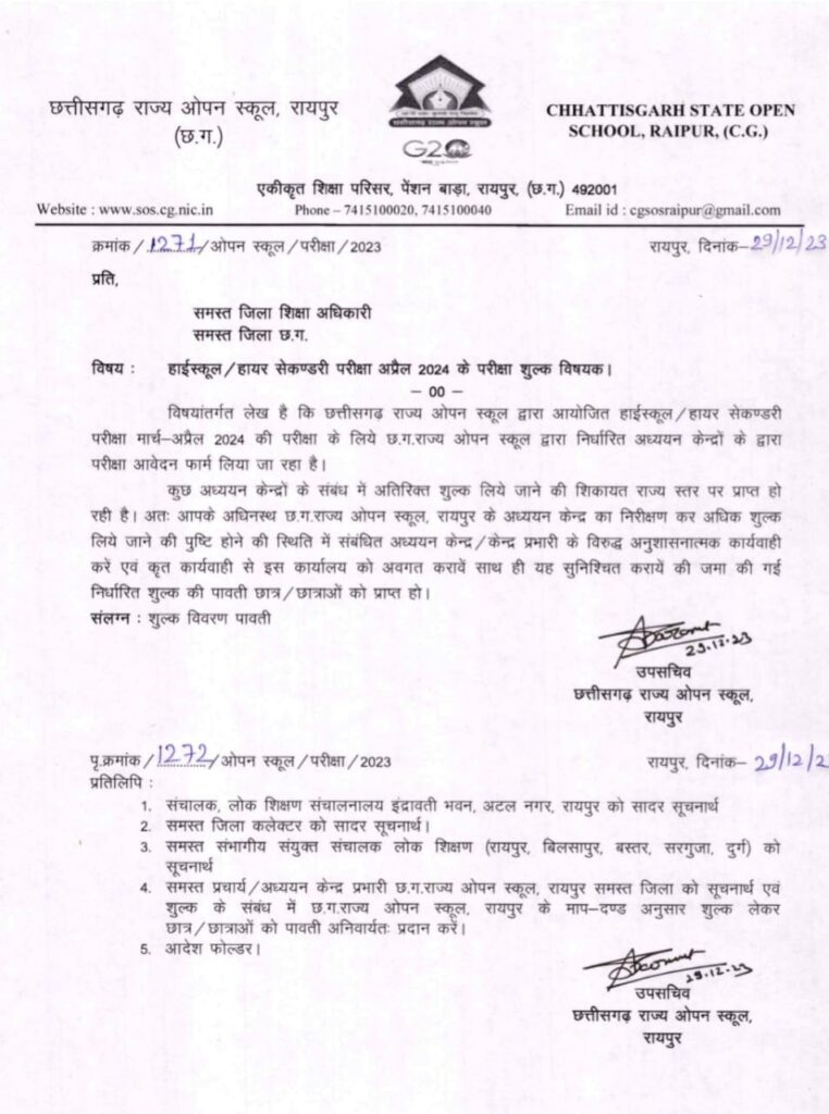 ऑफलाइन फॉर्म लेने की व्यवस्था का हवाला देकर दबाव डाला जा रहा ताकि ऑनलाइन फॉर्म में निर्धारित 1100 परीक्षा शुल्क की जगह 3500 से 4000 रुपए तक की वसूली की जा सके। शिक्षा विभाग द्वारा निर्धारित नियम के तहत निर्धारित शुल्क से अधिक राशि लिए जाने का प्रावधान नही है। ओपी चौधरी ने प्रदेश में चल रहे शिक्षा माफिया को समाप्त करने के उद्देश्य से शिक्षा विभाग को इस तरह की अवैध वसूली किए जाने के मामलो में जांच के आदेश देते हुए लगाम कसने कहा हैं।ओपी के कड़े तेवर देख तत्काल प्रदेश के समस्त जिला शिक्षा अधिकारियों को छत्तीसगढ़ राज्य ओपन स्कूल रायपुर द्वारा जारी आदेश क्रमांक 1271 तिथि 29 दिसंबर के तहत निर्देशित किया गया कि हाई स्कूल हाई सेकेंडरी परीक्षा अप्रैल 2024 के परीक्षा शुल्क के संबंध में अधिक शुल्क लिए जाने की शिकायत पर तत्काल जांच करे एवम अधिक शुल्क की पुष्टि की स्थिति में संबंधित अध्ययन केंद्र के खिलाफ विधिसम्मत कठोर कार्यवाही सुनिश्चित करे साथ ही जमा किए जा रहे शुल्क की पावती छात्रों को उपलब्ध कराई जाए। ओपी की इस पहल पर ओपन स्कूल की परीक्षाओं पर अधिक राशि वसूली पर रोक लग जायेगी।