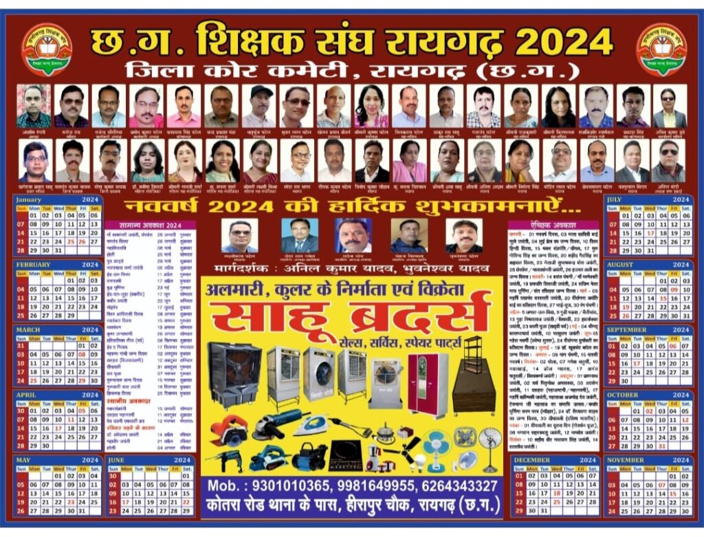 रायगढ़:- छत्तीसगढ़ शिक्षक संघ जिला रायगढ़ हमेशा से राष्ट्रीय हित, शिक्षा हित, छात्र हित, शिक्षा हित,शिक्षक हित सामाजिक हित व राष्ट्रीय विचार धारा को लेकर अग्रणी रहते हुए कार्य करता रहा है, फिर चाहे शिक्षकों अथवा कर्मचारियों के सर्वहित की बात हो,वेतनमान की बात हो, अथवा शिक्षकों कर्मचारियों की अन्य कोई भी मांग अथवा समस्या।,शिक्षक संघ की स्थापना ही अपने इन्हीं सभी उद्देश्यों को लेकर शिक्षक हितों के संघर्ष लिए हुई थी। उल्लेखनीय है कि,छत्तीसगढ़ शिक्षक संघ जिला रायगढ़ ने इस वर्ष अपने वार्षिक कैलेंडर का प्रकाशन कराया व छत्तीसगढ़ शिक्षक संघ जिला रायगढ़ के वर्तमान जिला अध्यक्ष श्री आशीष रंगारी व सचिव श्री मनोज राय के नेतृत्व में