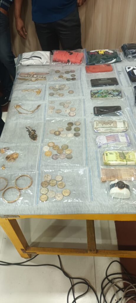 (1) 140 ग्राम सोने के जेवराज कीमत 7 लाख रूपये (2) 60 चांदी के सिक्के कीमत करीब 30,000 रूपये (3) 4 हाथ घड़ी (4) 1 मोबाईल (5) 20000 रूपये नकद कुल करीब 8 लाख रूपये की सम्पत्ति