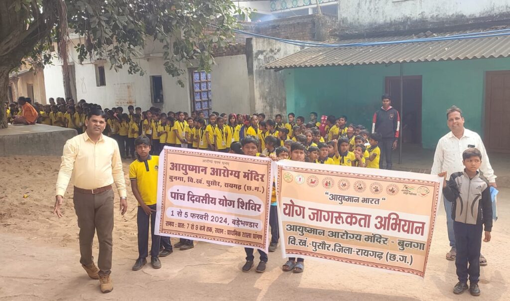 है जिसके लिए हर व्यक्ति को प्रतिदिन आधा घंटा योगा करना बहुत जरूरी है कार्यक्रम को सफल बनाने में फार्मेसिस्ट भोजकूमार मालाकार सरपंच श्री दीनबंधु सिदार सदभावना स्कूल के डायरेक्ट ओमप्रकाश गुप्ता प्राचार्य विशिकेशन गुप्ता संतोष प्रधान फूलचंद गुप्ता वृंदा मालाकार सतीश मैत्री संजुलता ममता भोय राजकुमारी कुजुर लक्ष्मी नारायण सिदार इत्यादि गणमान्य नागरिक जनप्रतिनिधि लोगों ने सक्रिय भूमिका निभाई